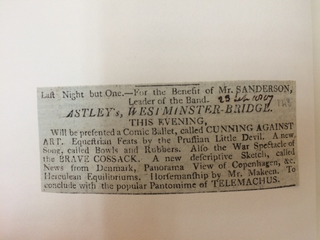 September 23, 1807Last Night but One.—For the Benefit of Mr. SANDERSON, Leader of the Band. ASTLEY’s, WESTMINSTER-BRIDGE. THIS EVENING, Will be presented...